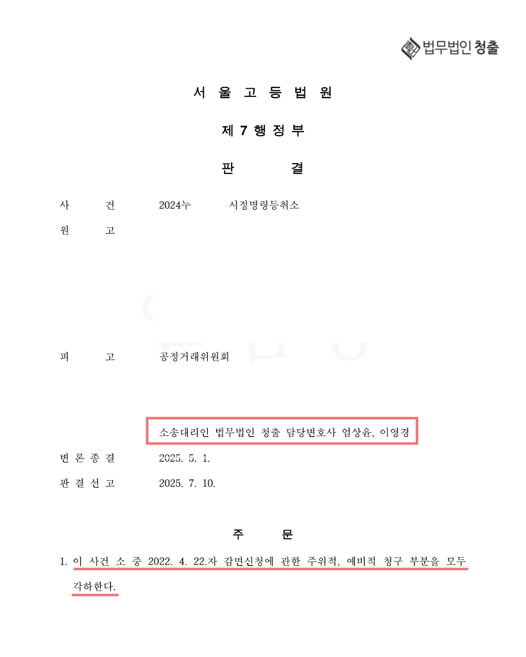 이번 사건은 대형 로펌(화우)을 선임한 원고가 '자진신고(리니언시)에 따른 감면' 및 '과징금 산정의 부당성'을 강하게 주장했으나, 청출은 자진신고 감면 요건에 대한 법리 주장을 통해 원고의 ‘거부처분’ 취소 판결에 대한 각하 판결을 이끌어 냈습니다.
