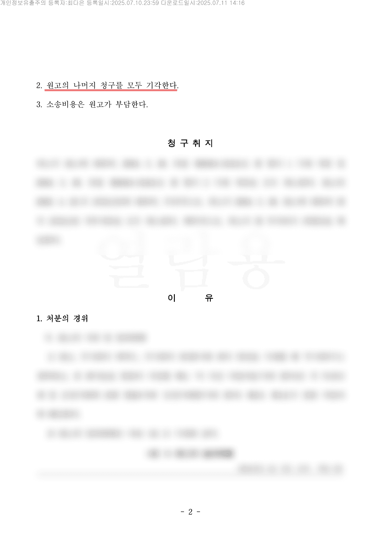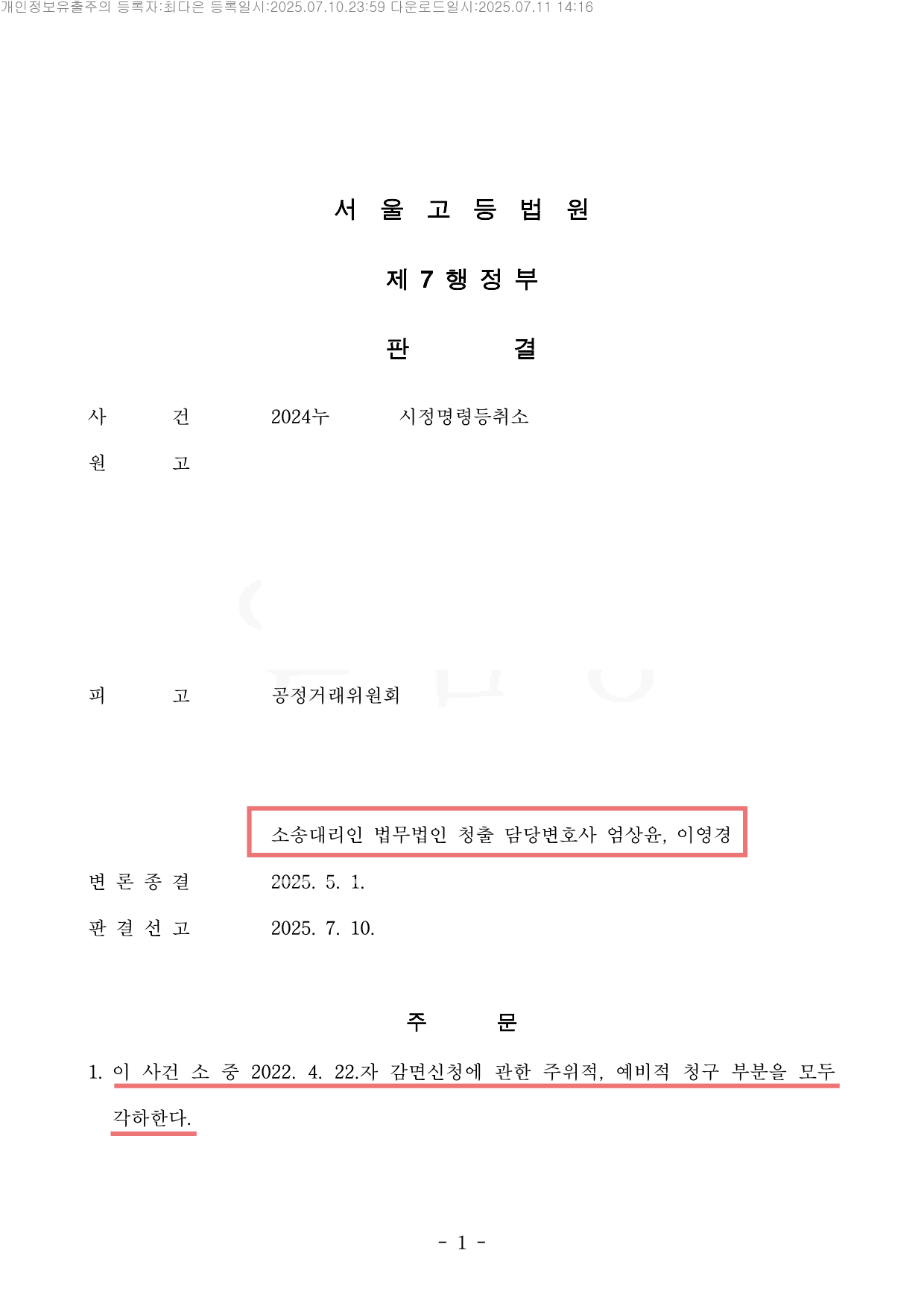 이에 법원은 청출의 주장을 대부분 받아들여, 감면신청에 대한 원고의 거부처분 취소청구 및 부작위위법확인 청구에 대해서는 각하하고, 과징금부과처분에 대한 원고의 취소청구는 기각하였습니다.