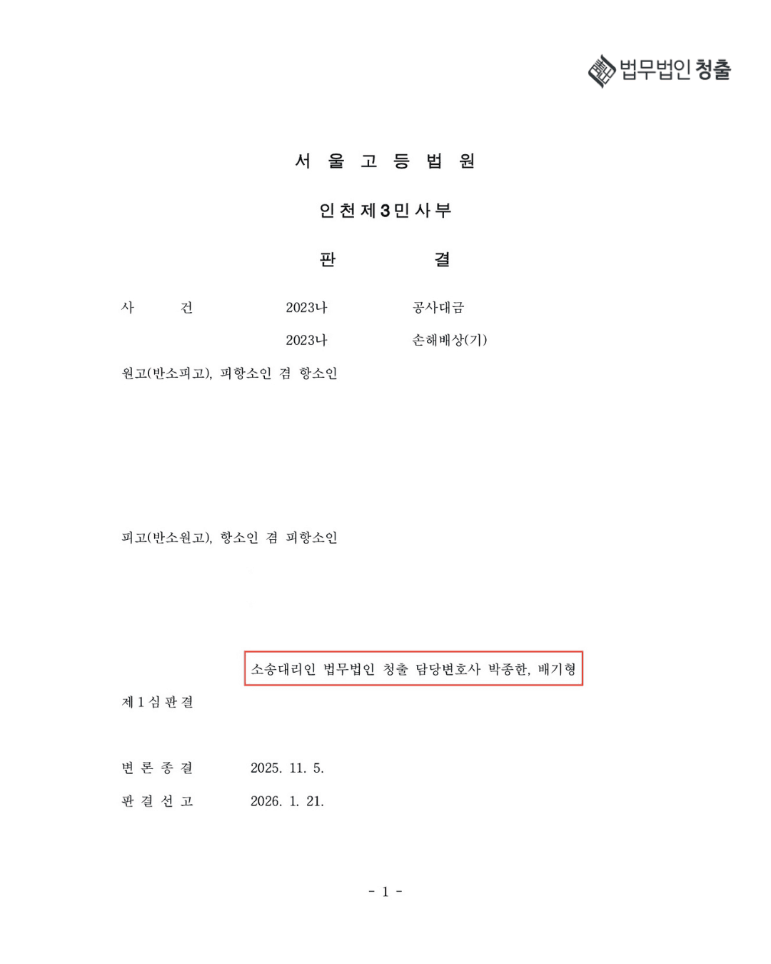 법무법인 청출(담당변호사 : 배기형, 박종한)은 도급인을 대리하여, 시공사가 청구한 공사대금 사건에서 제1심 3억 1,000만 원 인용 판결을 항소심에서 1억 1,000만 원으로 감액시키는 성과를 도출하였습니다. 항소심은 설계변경 추가공사비 쟁점에서는 1심의 판단을 유지하였으나, (i) 옥상방수(구배) 하자 및 (ii) 지체상금(지체책임의 귀속)에서는 1심의 판단을 반대로 뒤집어 해당 손해배상액만큼을 인정하고, 이를 공사대금에서 상계하는 도급인의 주장을 받아들였고, 그 결과 본소 인용액이 실질적으로 축소되었습니다.