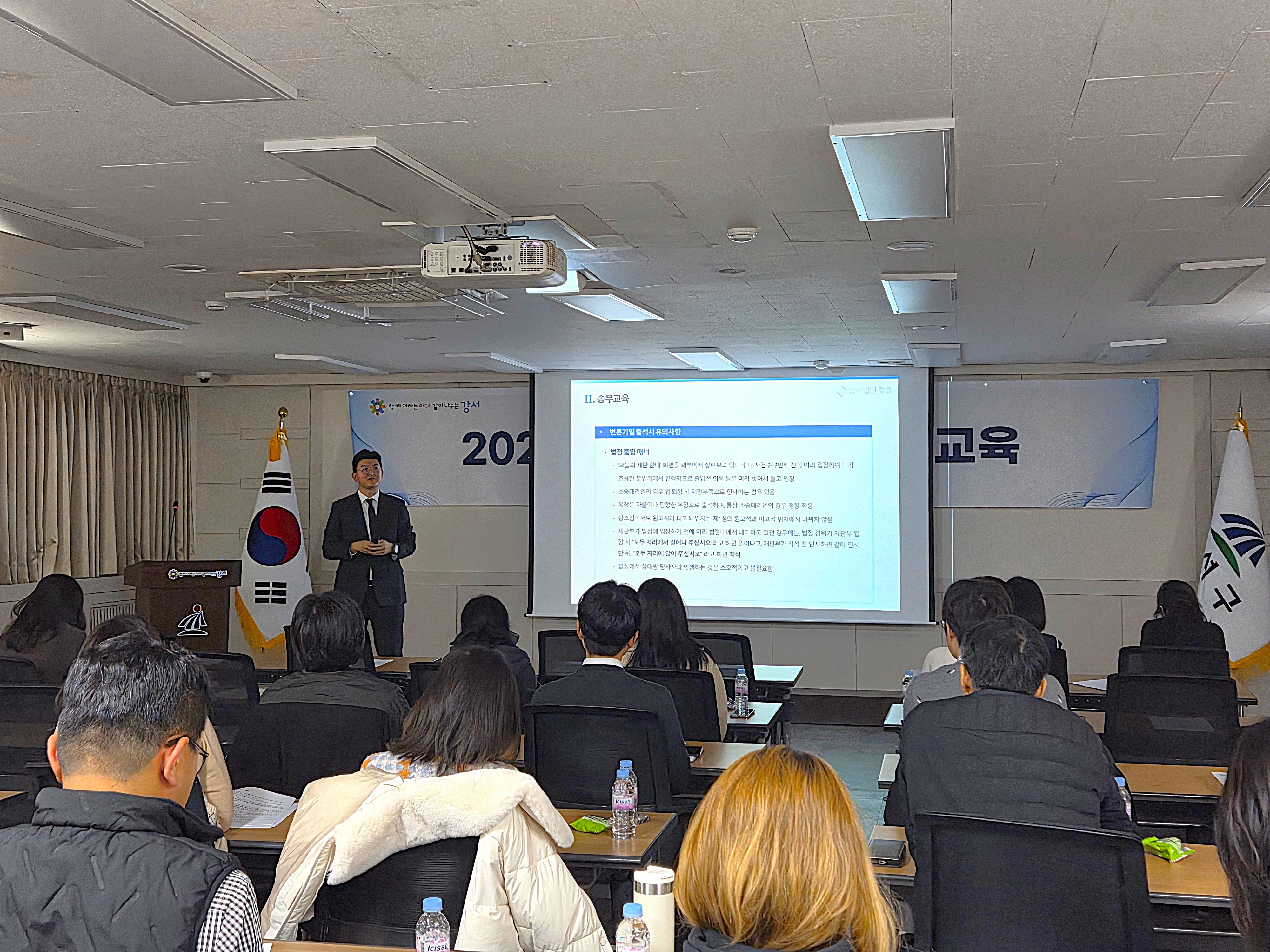 법무법인 청출 신준선 변호사는 2025. 12. 17.(수) 서울특별시 강서구청의 법률고문으로서 강서구청 본관 3층 대회의실에서 강서구청 소송수행자들을 대상으로 실무 중심의 법률∙송무교육을 진행하였습니다.